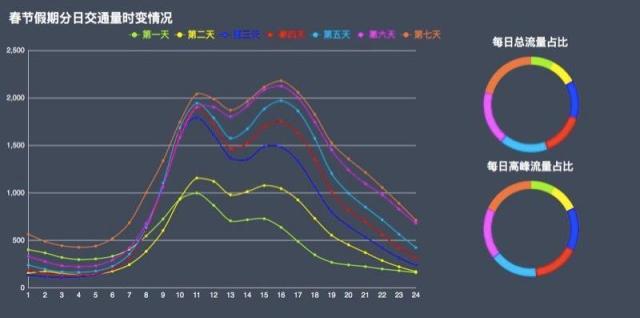 第三阶段2月15日(除夕)至2月25日(正月初十):交通流量呈“低开高走,呈现双峰”态势,2月15日(除夕)交通流量降至春运期间最低值。17日(初二)至19日(初四)以探亲访友中短途出行为主,2月20日(初五)、21日(初六)出现集中返程,正月初六为第一个返程高峰。受调休的影响,春节后的第一个周末正月初九、正月初十是第二个返程小高峰。