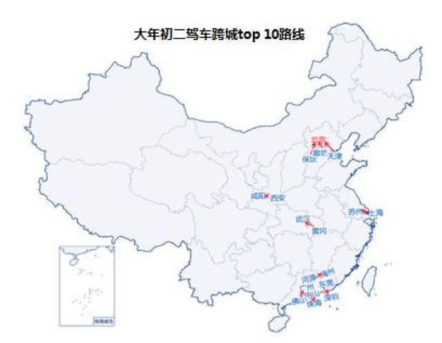 与区域经济一体化水平相一致,春运期间全国驾车跨城出行路线主要集中在长三角、珠三角、京津冀区域(见图10-1),最活跃的路线是东莞-深圳,其次是佛山-广州(见图10-2)。