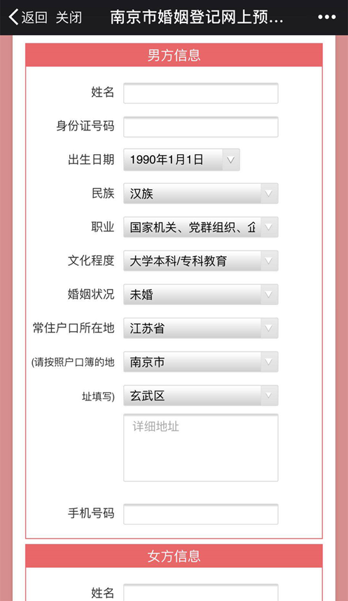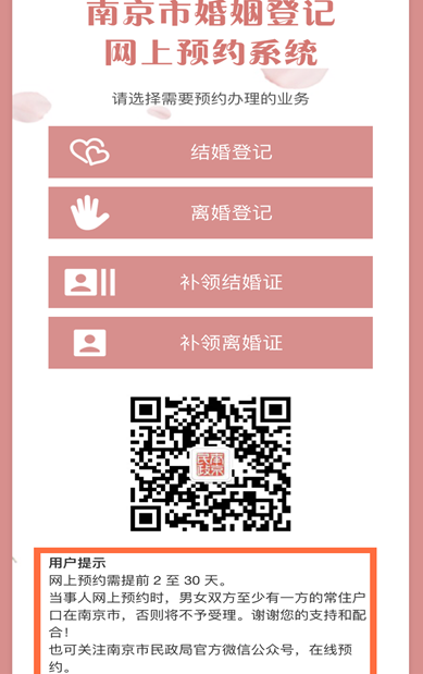 关注“南京民政”微信公众号,点击底部“民政服务”菜单栏—点击“婚姻预约”即可进行预约啦!