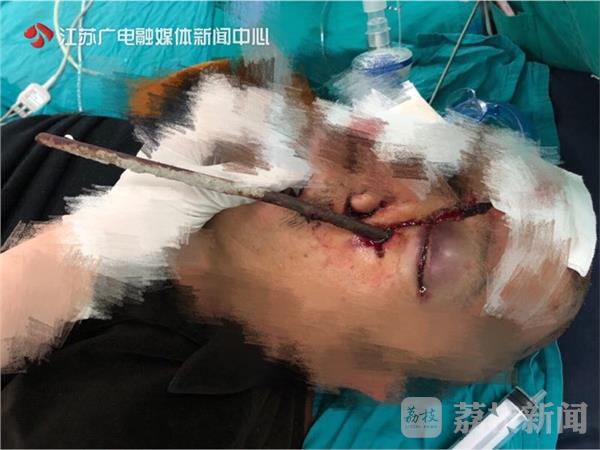 经过1个多小时的紧急转运,患者来到南京鼓楼医院急诊科,入院检查时,患者表情痛苦 ,由于高处坠落伴有颅内挫伤,患者神态非常烦躁。从CT片上看,钢筋沿着前颅底刺入左侧额叶,在脑内已伤及血管并出现颅内血肿,因此患者的伤情不仅严重而且危险。同时前颅底又是神经和血管的密集区,有动眼神经、视神经、嗅神经、外展神经、颈内动脉及其分支。神经外科治疗团队决定即刻为患者行开颅异物取出术,在术中,医生需要将患者左侧额骨取下,显露前颅底,寻找到刺入颅内的异物,在直视下从颅外将异物拔出。术前医生们同时做了两手准备,一、在拔出异物后,患者如果出现颅内大出血,立即止血,行血肿清除;二、如果拔出异物仅有少量或没有血液渗出,就对患者前颅底的硬脑膜进行修补,防治术后脑脊液漏,减少颅内感染可能性。经过一个半小时的紧张手术,这根长30厘米的钢筋被成功取出,患者术中也未出现大的出血。并修复了破损的硬膜,清理了伤道中的铁锈、碎骨和坏死的脑组织。专家介绍介绍:颅内外贯通异物比较罕见,常见的致伤物有钢筋、铁钉、铅笔及木质性尖物等。主要经眶板、筛板、颞骨等骨质薄弱处穿入颅内。主要治疗措施就是控制出血,清除颅内异物及坏死组织,修复硬脑膜,预防颅内感染等。由于异物可将病原菌经伤道带入颅内,因此,颅内积气或脑脊液漏大大增加颅内感染几率,严重颅内感染可造成生命危险。