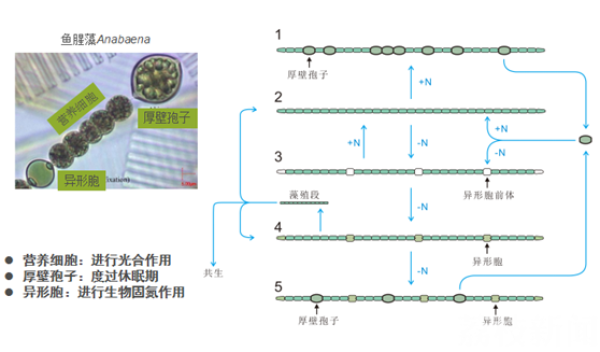 蓝藻的异形胞是为了应对地球氧气浓度上升、保护其中对氧气敏感的固氮酶而产生的。这项研究表明,早在8亿年前,地球存在着大量需要氮的生物,这项研究成果也为研究早期地球环境演变、生物繁衍进化提供了新的材料和思路。