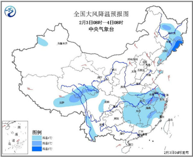 在冷空气影响下,周末两天,中东部大部气温持续偏低,为此中央气象台今晨继续发布大风降温预报,预计,受冷空气影响,3日至4日,我国中东部大部地区自北向南将先后出现4~5级偏北风,阵风7级,东北地区中东部、黄淮南部、江淮、江汉、江南大部等地有4~6℃降温,局地降温可达8℃以上;东部和南部海区有7~8级、阵风9级的偏北风。
