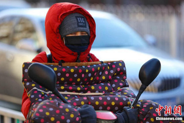 ↑昨天(2月2日),北京现大风降温,出行市民包裹严实。(图片来源:中新网)