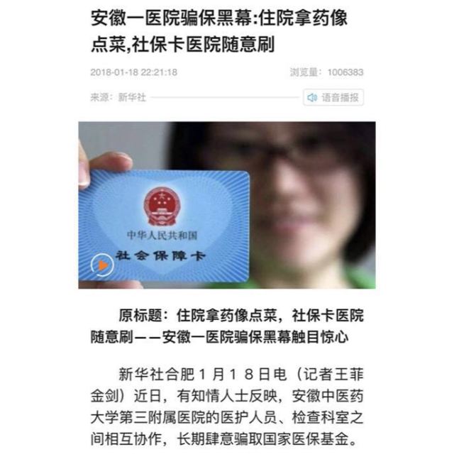1月18日,新华社新媒体专线播发《(中国网事)住院拿药像点菜,社保卡医院随意刷——安徽一医院骗保黑幕触目惊心》,独家报道了安徽中医药大学第三附属医院骗保问题,引起社会广泛关注。1月19日,在事件曝光的第二天,由安徽省人社厅、安徽省卫生计生委、安徽省中医药管理局、安徽省中医药大学等部门组成的联合调查组即进驻该医院展开调查。人社部和国家中医药管理局也专门派员赴安徽督促调查。