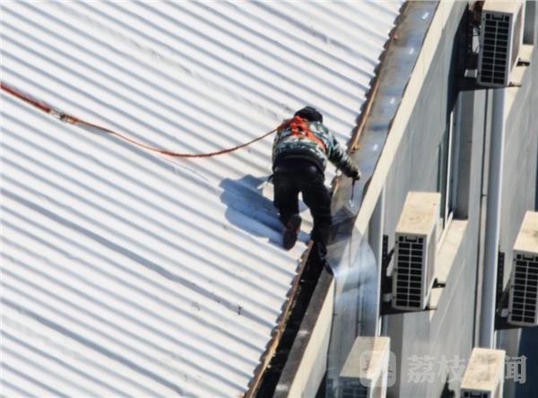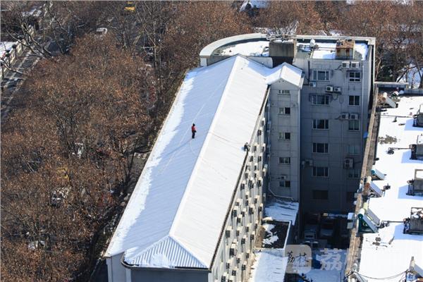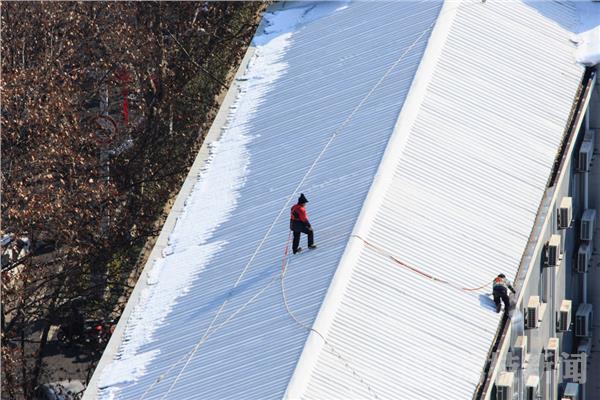 笔者现场看到,场面惊心动魄,一般的人爬上去不用干活都可能会两腿发软。屋顶光滑还有积雪,走路打滑危险重重,他们冒险工作,大家都捏了一把汗。笔者提醒,年关将至,近来气温较低,积雪不易融化,楼顶坡度大,结冰打滑,非专业人士切勿爬上楼顶除雪,以免发生意外。