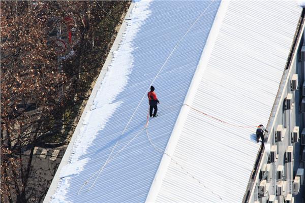 2018年2月6日上午,南京市鼓楼区玉泉路一小区,楼房一侧靠北京西路,下面人来人往,房顶积雪,请来了维修工人,清雪兼维修。笔者年看到,三位男士,腰上都系上了安全绳,他们以屋尖分界,各分两边,其中一个人站在屋檐水槽边清理和维修,另一边有两个人抓着他腰上的绳子拖拽。