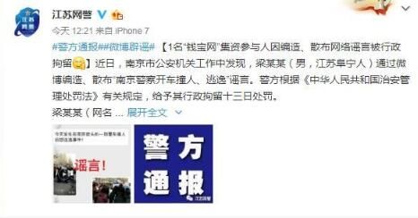 梁某某(网名“江南大学桃园园长”)系“钱宝网”集资参与人,因对警方查处“钱宝网”非法集资不满,将一起民警出警处理小区业主更换物业纠纷警情中的视频,编造、散布为“南京警察开车撞人、逃逸”的谣言,在新浪微博上散布,后被不明真相的网民大量转发。经调查,梁某某在“钱宝网”非法集资案发后,曾多次在微博上编造多个虚假信息,发泄自己的情绪,利用互联网散布谣言,扰乱公共秩序,违反了《中华人民共和国治安管理处罚法》有关规定,公安机关依法给予其行政拘留十三日处罚。 警方再次提醒,网络不是法外之地,对于编造、散布谣言,扰乱公共秩序的行为,公安机关将依法查处,希望广大网民不造谣、不信谣、不传谣,共同维护良好的网络环境。