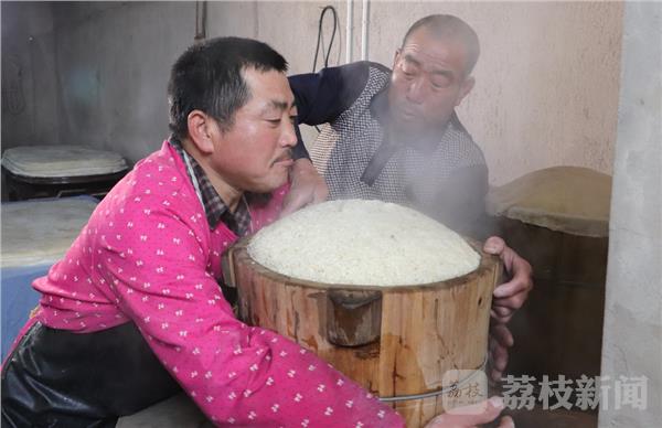 说起打糍粑,这不仅是体力活,也是一门技术活,从选米、浸泡、烧火蒸米,再到最重要的捶打都非常讲究。刘国富告诉记者,做糍粑用的米是当年自家地里种的有机糯米,再将选好的糯米提前浸泡20多个小时,用旺火蒸半个小时,最后将蒸好的米饭放入舂臼内进行反复捶打,直至完全打烂如泥。“先打的是米饭,米饭打成饭泥,半成品以后再用棍子捣,打不到边的时候,再用棍子捣,捣成饭泥以后要翻一下,再打另一面。”