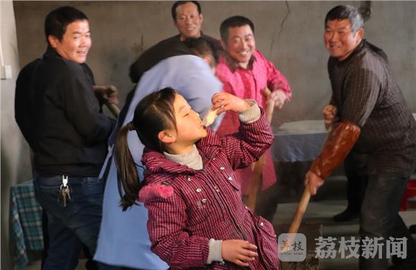 快过年了,对于句容市天王镇唐陵村的刘国富一家来说是格外忙碌的的日子,每年春节前的一段时间,刘国富都会约上亲戚朋友一起来家里打糍粑。在刘国富家中,大伙正拿着木锤敲打糍粑。伴随着舂臼“嗵,嗵”声,和着糍粑幽幽的清香,大家在热闹的氛围中把一年的丰收和喜悦都融进了打糍粑的乐趣中。