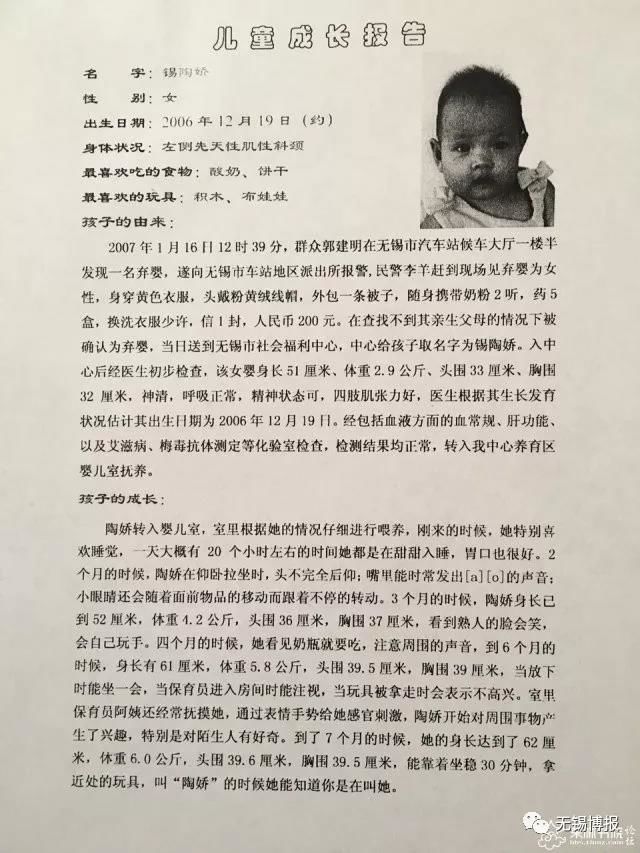 11年前,刚出生不久的锡陶娇被父母遗弃在无锡汽车站候车大厅,被民警发现后,锡陶娇被送入无锡市社会福利院,之后又被美国夫妻收养。