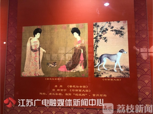 吴阗说:“唐代周昉的《簪花仕女图》,也有这么一条狗,很有意思;旁边是清代郎世宁的《竹荫酉犬图》,这是一个西洋画法;《瓶花卧狗图》则是太平天国苏州忠王府的版画。”