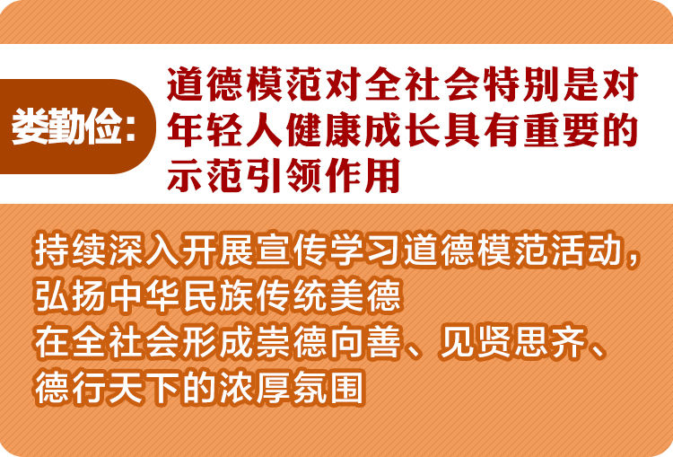 娄勤俭对随行的地方领导和省级部门负责人说,精神的力量是无穷的,道德模范对全社会特别是对年轻人健康成长具有重要的示范引领作用。要持续深入开展宣传学习道德模范活动,弘扬中华民族传统美德,用社会主义核心价值观凝魂聚力。要给道德模范以更多关怀关心,彰显道德模范崇高的社会地位,在全社会形成崇德向善、见贤思齐、德行天下的浓厚氛围。