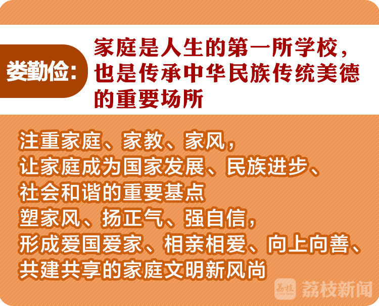 慰问中,娄勤俭指出,家庭是人生的第一所学校,也是传承中华民族传统美德的重要场所。各级党委政府要深入学习贯彻习近平总书记关于注重家庭、注重家教、注重家风的重要指示精神,充分认识家庭文明建设的重要性,扎实推进家庭文明建设各项工作,真正让家庭成为国家发展、民族进步、社会和谐的重要基点。要引导人民群众利用春节等传统节日塑家风、扬正气、强自信,推动形成爱国爱家、相亲相爱、向上向善、共建共享的社会主义家庭文明新风尚,让好家风撑起社会好风气。