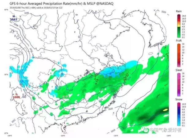 △美国GFS已开始认为江浙沪皖有小规模降雪,图片来自tropicaltidibits或中国气象爱好者根据GFS公开数据制作