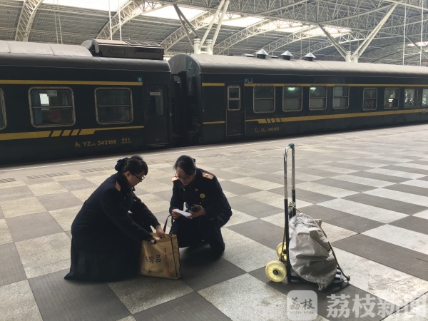 铁路南京站2楼的候车室,负责遗失物品保管的许凤琴从客运员周文的手中,接过一个旅客遗失的双肩包。仔细查看完里面的物品后,她将双肩包放在小推车上,对讲机里又传来了一楼站台有人遗失了一个手提袋,需要她接收的消息。