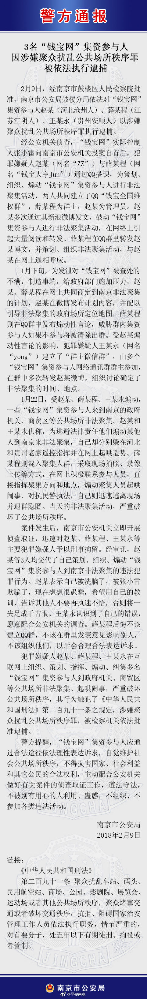 2月9日下午,@平安南京 发布通报,3名“钱宝网”集资参与人因涉嫌聚众扰乱公共场所秩序罪被依法执行逮捕。