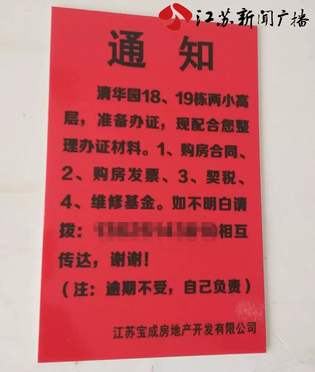 2013年,宿迁沭阳市民陶阿姨在当地一个名叫“清华园”的小区买了套房子,位于小区19栋12层。但18栋、19栋两栋小高层交付后,却一直不能办产权证。去年8月,两栋楼里终于贴出告示,告诉业主能去当地不动产登记窗口办产权证了。