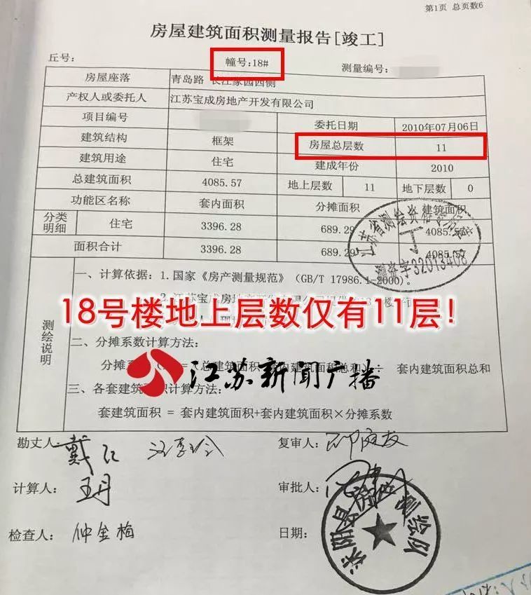 在沭阳县政务服务中心不动产登记窗口,工作人员告诉业主,清华园小区18、19栋楼的12层,没有面积测绘报告,不动产证不能办理。但在两栋楼报告首页,业主们惊奇的发现,这两栋楼只有11层!