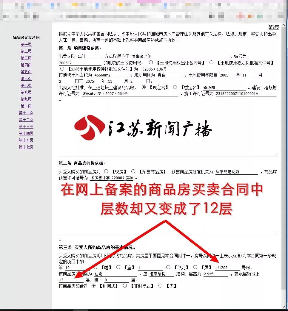 但在沭阳县住建局官方网站,记者找到了部分业主备案的合同。合同上清清楚楚的写着,地上楼层层数就是12层!