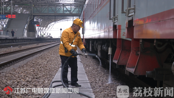 南京火车站客运上水班长朱陵介绍说,春节期间,他们也为班组备了一些零食,水果,让他们在这里感受到一些春节的气氛,但是还是要保证每趟列车的上水。