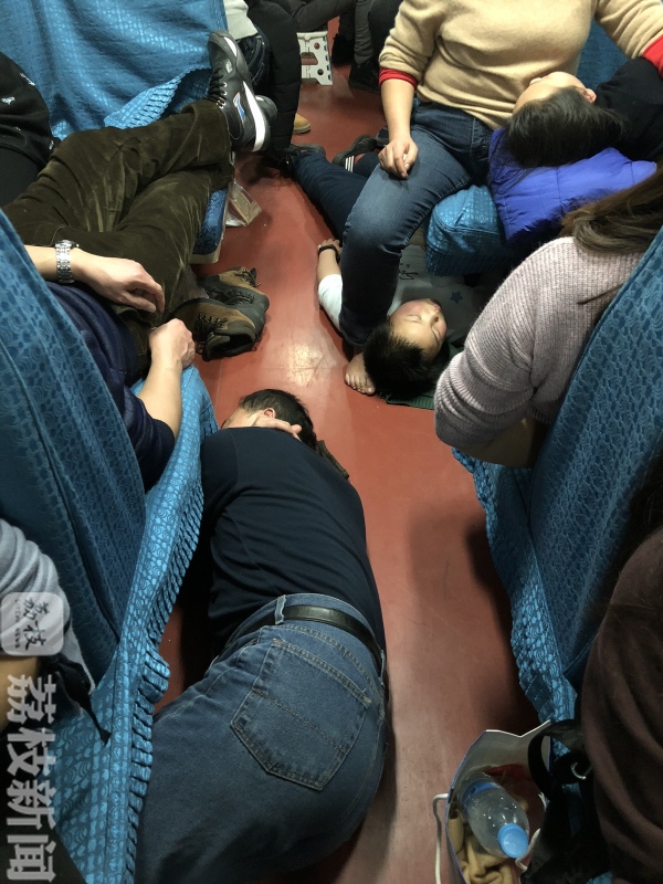 在火车的过道上,甚至还有旅客因为太辛苦,直接躺在地上休息了。