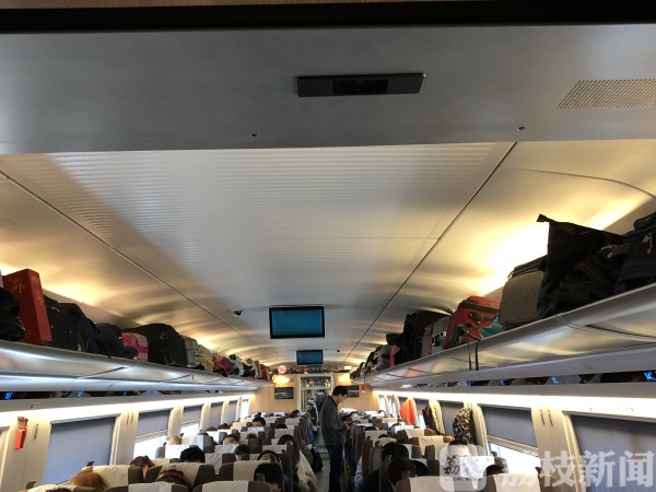 在乘务人员的指挥下,大部分行李箱都得到了安置,K4769次列车也动了起来。因为春节返乡旅客比较多,走道上、车厢之间的区域,满满当当都是没买到座位的乘客。