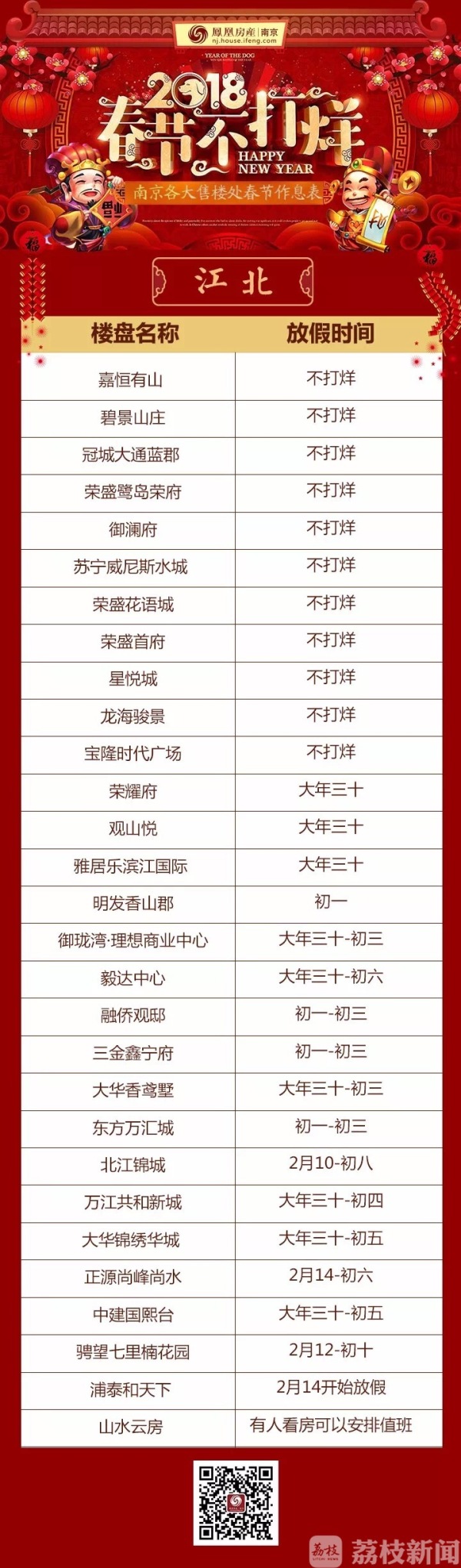 今年春节“不打烊”的52家楼盘主要集中在江北和江宁,这两个板块共有29家楼盘在春节期间依旧开门迎客,其余几个板块差不多,河西和城东有5家、城南和仙林有4家、城北有6家。