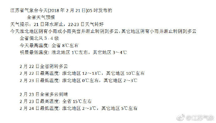 20日午后两点,雨水覆盖的江苏西南部地区气温仍然偏低,仅有5度左右。今天是春节假期最后一天,淮北地区阴有小雨或小雨夹雪并渐止转阴到多云,其它地区阴有小雨并渐止转阴到多云,全省偏北风3-4级,提醒开车返程的朋友要注意防范道路湿滑、低能见度对交通带来的不利影响。明天,全省天气转好,最高气温逐步回升到十度以上。23号全省多云到晴,全省最高温度达到15℃左右。