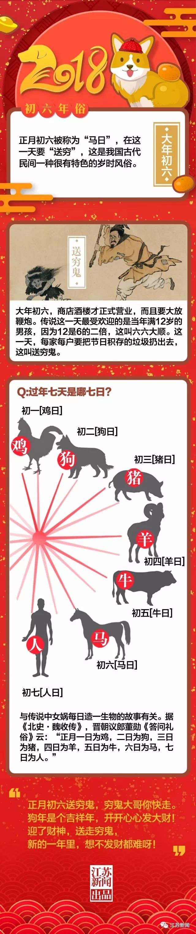 农历正月初六又称马日,在这一天要送五穷,包括智穷、学穷、文穷、命穷、交穷,希望新的一年与穷无干,富贵有余,是中国民间一种很有特色的岁时风俗。