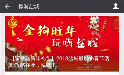 节前,盐城市旅游局专题汇编了“金狗旺年·玩嗨盐城—春节假日活动让你畅游狂嗨”的景区活动集萃,在扬子晚报、新华网、中国新闻网、今日头条、盐城广播电台等市内外媒体和旅游咨询网点、LED宣传屏等高频宣传,预热启动春节市场。“盐城市丹顶鹤湿地”还被国家旅游局列入《2018春节假日旅游指南》向全国推荐,春节期间游客量增加迅猛。节前节中,盐城市旅游局和各大景区充分利用微信平台做好旅游宣传,“微游盐城”、“大丰旅游”、“荷兰花海”、“东台西溪文化景区”、“阜宁旅游”、“金沙湖旅游度假区”等微信公众号适时推送市场讯息,引导游客出游。江苏卫视《江苏新时空》还重点宣传报道了东台西溪灯会和新春踩街巡游活动、阜宁新春灯会盛况。