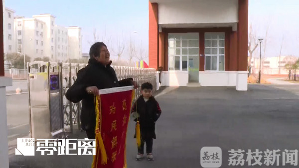 2月28日上午,宿迁泗阳县刘桥村七组的刘彩霞拿着锦旗来到西康实验小学,感谢该校的保安倪金良。