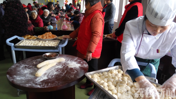现场志愿者们还为老人包起南瓜元宵,所用材料是糯米面和南瓜,馅料采用豆沙和黑芝麻馅,看着现场老人开心地吃着可口的元宵,志愿者们也非常开心。