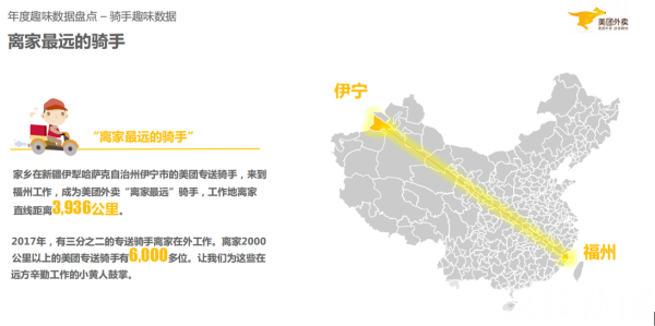 在美团外卖50万活跃骑手中,有三分之二的专送骑手离家在外工作。安徽省阜阳市、重庆市、河南省周口市分别以全年向美团外卖输送18635位、17629位、11105位专送骑手,成为骑手来源最多的省份。其中,家在新疆伊宁的美团专送骑手到福州工作,工作地离家直线距离3936公里,成为美团外卖“离家最远”骑手。