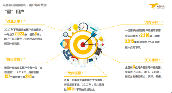 不知道从什么时候开始,外卖成了生活中一种空气般的存在。近日,美团外卖发布了《2017年度趣味数据盘点》,数据显示,2017年美团全部骑手一年骑行距离达53.5亿千米,相当于绕地球赤道13万圈,骑手个人最高年度收入达163188元,夜宵单量年度最高售出58028单,美团外卖用户一年最高下单达2923单,日均8单,据了解,这位用户出自南京!
