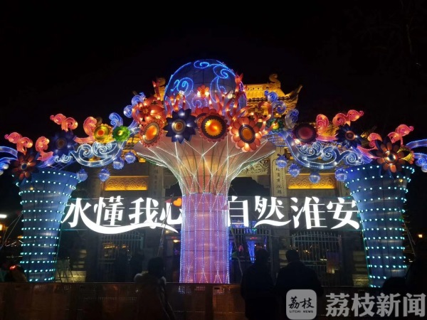 在淮安市区里运河畔,灯光璀璨,夜景如画,正在这里举办的里运河新春灯会吸引了广大市民前来赏灯游玩。