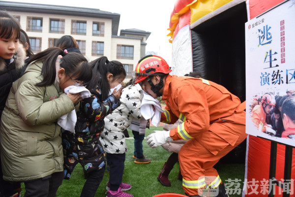 “小朋友们要记住,在发生火灾时,不能乘坐电梯,一定要从安全通道逃生,如果有烟雾,就要戴防毒面罩,或者和现在一样用湿毛巾捂住口鼻低下身子走出来。”在消防展示区,消防官兵不仅向孩子们介绍了消防设施器材的名称和用途,还在烟热环境逃生体验中,来自盐城市消防支队城南消防大队戴庄路中队的消防员们,通过模拟的消防安全疏散逃生演练,进一步增强了师生应急逃生的意识和自救能力。