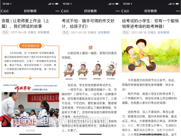 南京市第二师范学院附属小学副校长刘春生,去年年初创办了“好好教师”个人公众号,平均每三天他就推送一篇原创文章,里面涵盖了他30多年的语文教学心得,吸引了师生和家长们纷纷前来取经交流。刘春生告诉记者:“目前点击量最高的是考试方法、考试技巧,其次还有一些名师课堂实录,我对它进行一些专业化的解读。其他教师就可以用我们的课堂设计,直接运用到教学中。”