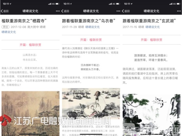 90后教师沈啸,在南京大学附属中学教历史,也是南京首个“楹联教学中心”的骨干。由他开设的“啸啸说文化”公众号清新风趣、传统文化底蕴深厚,短短半年已经吸粉数千。“我就想借助互联网的力量,去做一个新课程的尝试,我会把时事政治、各种活动、节日之类的,用楹联去表述出来,传播优秀的中华传统文化,唤起孩子们对南京全新的认识和他们的家国情怀。”沈啸说。