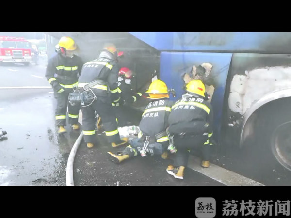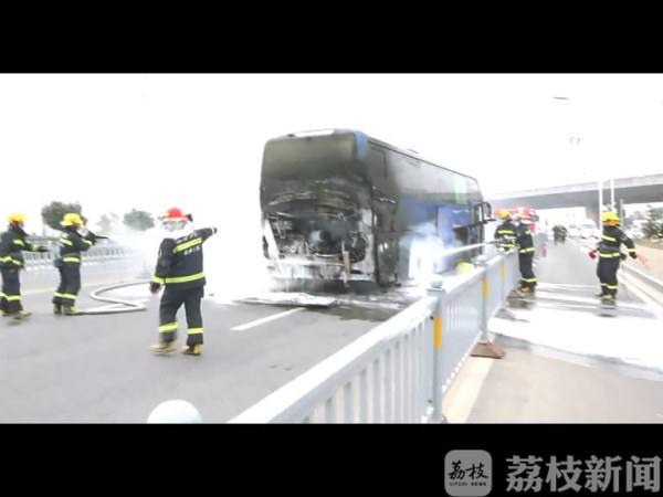 中队消防官兵到达现场后,发现一辆客车尾部发动机着火,火势处于猛烈燃烧阶段,并迅速蔓延。