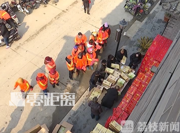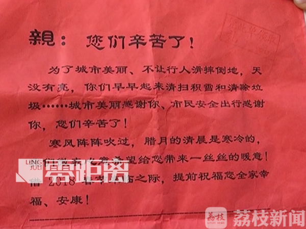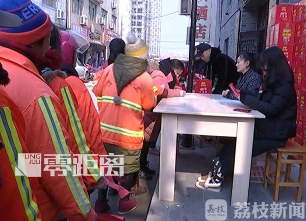 中午12点左右,环卫工人陆续拿着慰问单来到了现场,慰问单上几句亲切的问候,让环卫工人在这个寒冷的冬天倍感温暖。