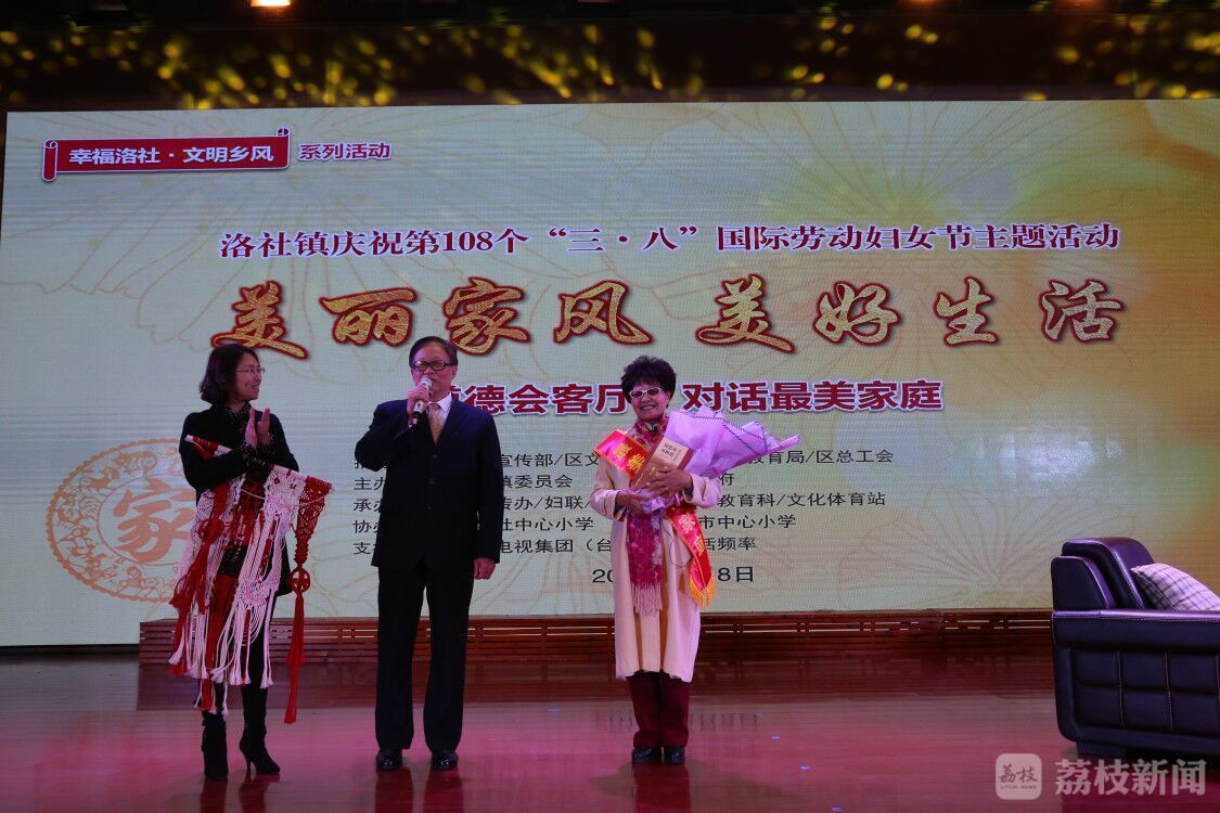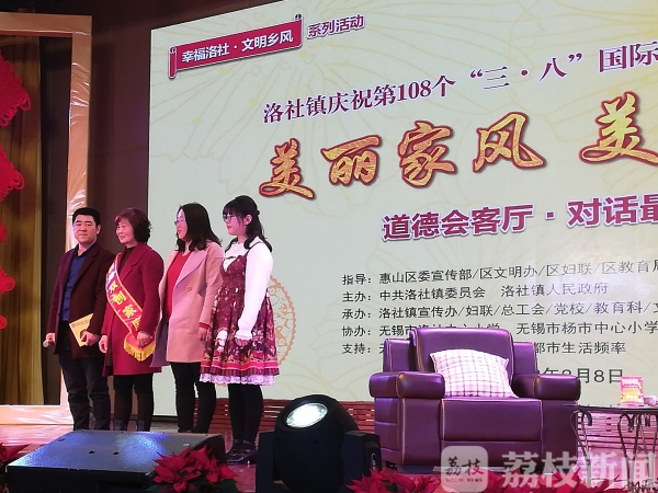 3月8日是第108个“三八国际妇女节”,在无锡洛社中心小学小龙人剧场,上演了一场和睦温馨的最美家风展示会。来自洛社镇的4个道德榜样家庭走上舞台讲述家风故事,诵读价值箴言,会场不时响起的阵阵笑意和阵阵掌声,传递了全镇干部百姓代表和应邀参加的相关领导对最美家庭的祝福,对他们美好家风的嘉许。