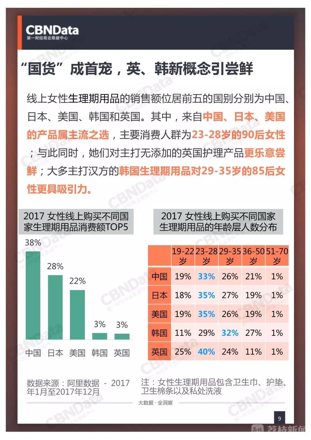 从产品的品牌国别来看CBNData《研究》中女性生理期用品的销售额,可见位居前五的分别为中国、日本、美国、韩国和英国。其中,来自中国、日本、美国的产品属主流之选,主要消费人群为23-28岁的90后女性;与此同时,她们对主打无添加的英国护理产品更乐意尝鲜;大多主打汉方的韩国生理期用品对29-35岁的85后女性更具吸引力。
