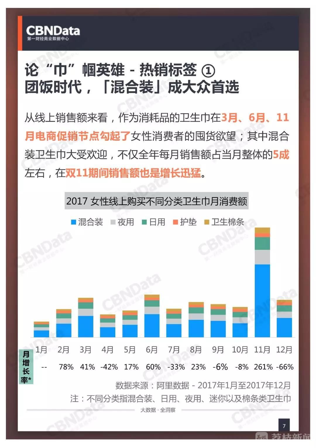 鉴于此,目前市场上的卫生巾主要分为日用、夜用、护垫、卫生棉条以及囊括多类产品的混合装。纵观CBNData《研究》中五类卫生巾在2017年的销售额,作为消耗品的卫生巾在3月、6月、11月电商促销节点勾起了女性消费者的囤货欲望;其中混合装卫生巾大受欢迎,不仅全年每月销售额占当月整体的5成左右,在双11期间销售额也是增长迅猛。