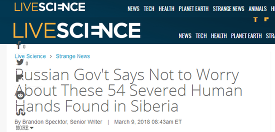 美国“生活科学网”:关于西伯利亚发现的54只断手,俄政府说不要担心。