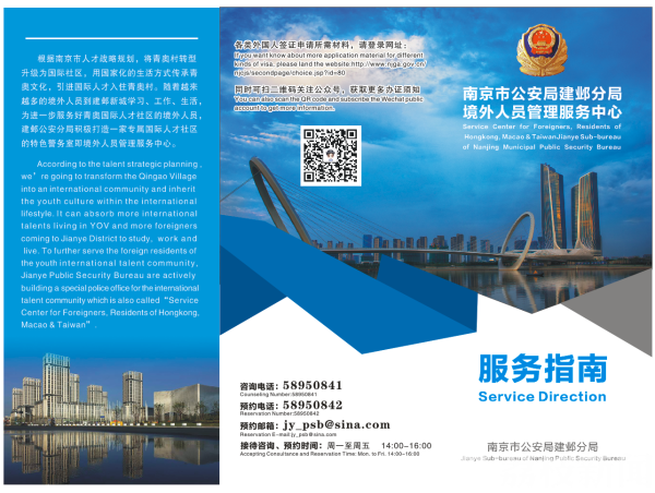 中心的实际使用面积大约为200平米,目前配有境外人员申报临时住宿登记自助机,以及咖啡机,饮水机,书籍杂志等便民服务设施。中心的主要业务为受理外国人签证申请,受理居住在建邺区的境外人员申报临时住宿登记,开展法律法规宣传与咨询服务,举办促进中外文化交流的丰富多彩的联谊活动,让辖区的外国人更快地融入到社区生活中。中心采取预约制办证服务,由于目前周边境外人员较少,中心将根据每日接待咨询和预约时间情况确定每周受理办证时间,接待咨询和预约申请的时间为周一至周五14:00至16:00。