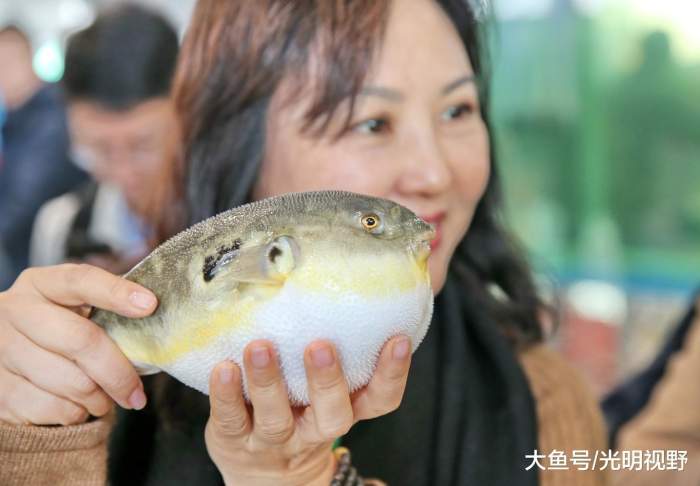 上海游客与河豚亲密接触。