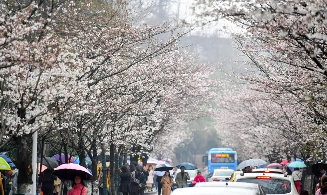 3月18日,南京阴雨绵绵,但是鸡鸣寺路依然人气不减。众多市民前往这里欣赏雨中的樱花。