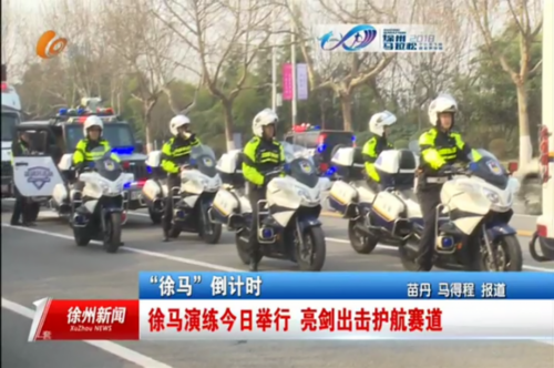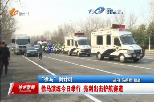 徐州市交警支队泉山大队大队长 王文强:今天我们这边主要是为了2018年徐州国际马拉松比赛,做一些准备工作,特别是对于我们所用的保障车辆,一些我们各个工作环节的一个检验,现在你在现场看到的就是我们一些现场的线路勘察车,我们的指挥车以及各种裁判车在线路上进行演练。