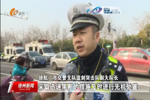 徐州市交警支队蓝剑突击队副大队长 徐航:一旦发生突发的紧急情况,我们将根据预案和现场指挥部的指令,采取迅速果断的措施及时进行先机处置,全力维护赛事的正常秩序。