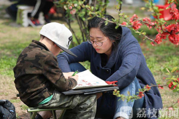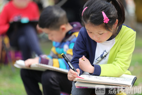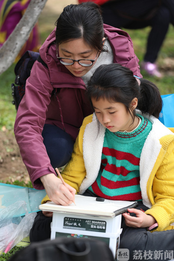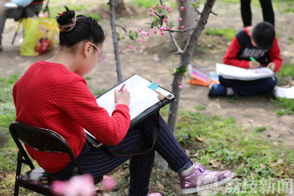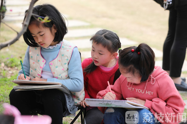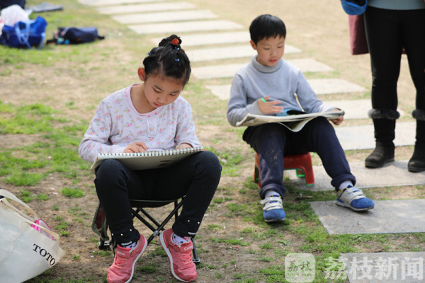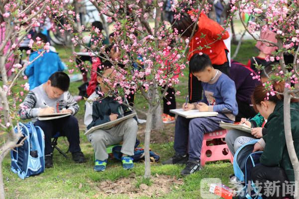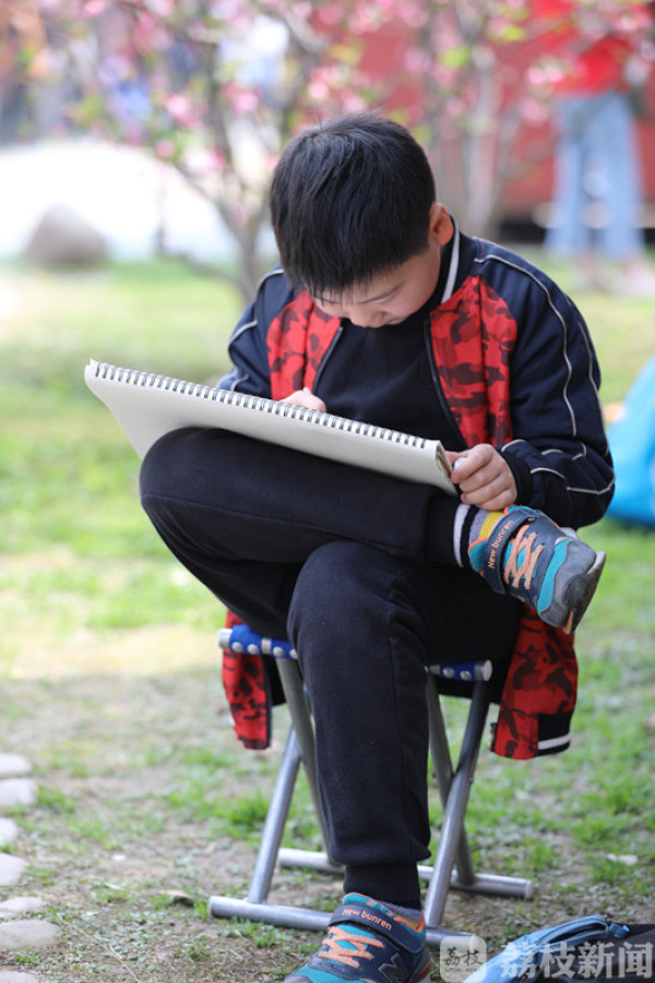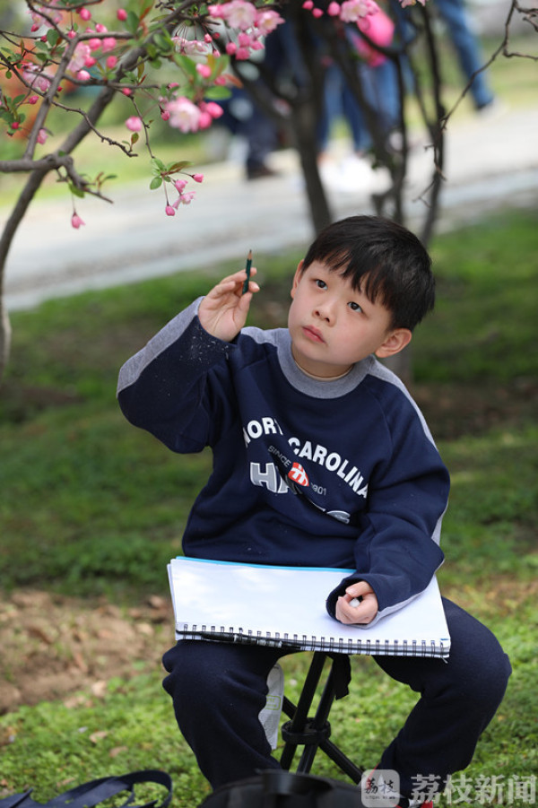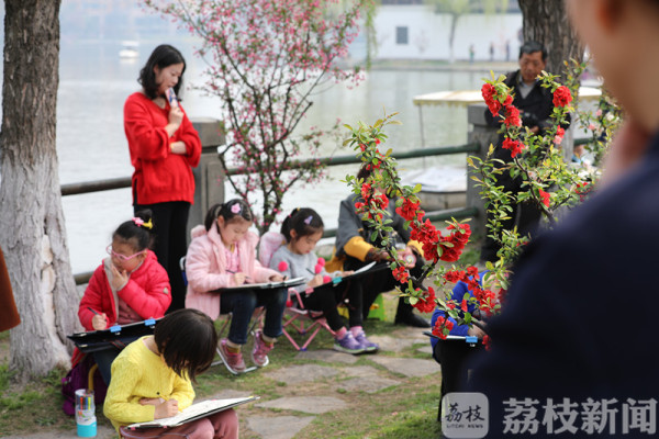今天(3月25日)上午,荔枝新闻网友在莫愁湖公园看到,公园里除了络绎不绝的赏花市民和游客外,还有不少来这写生的小朋友。他们三五成群端坐在海棠树下,用画笔记录和描绘着春天的美景。